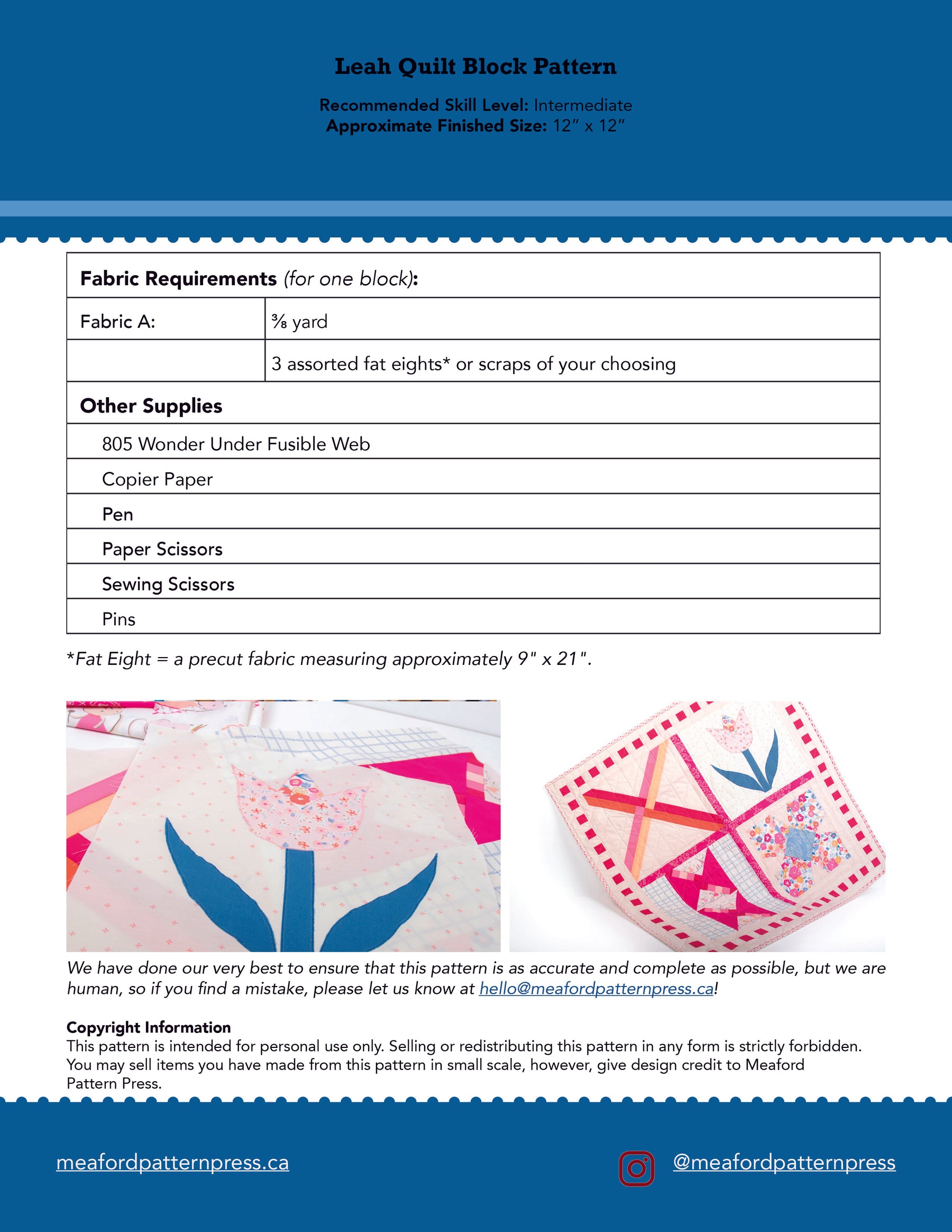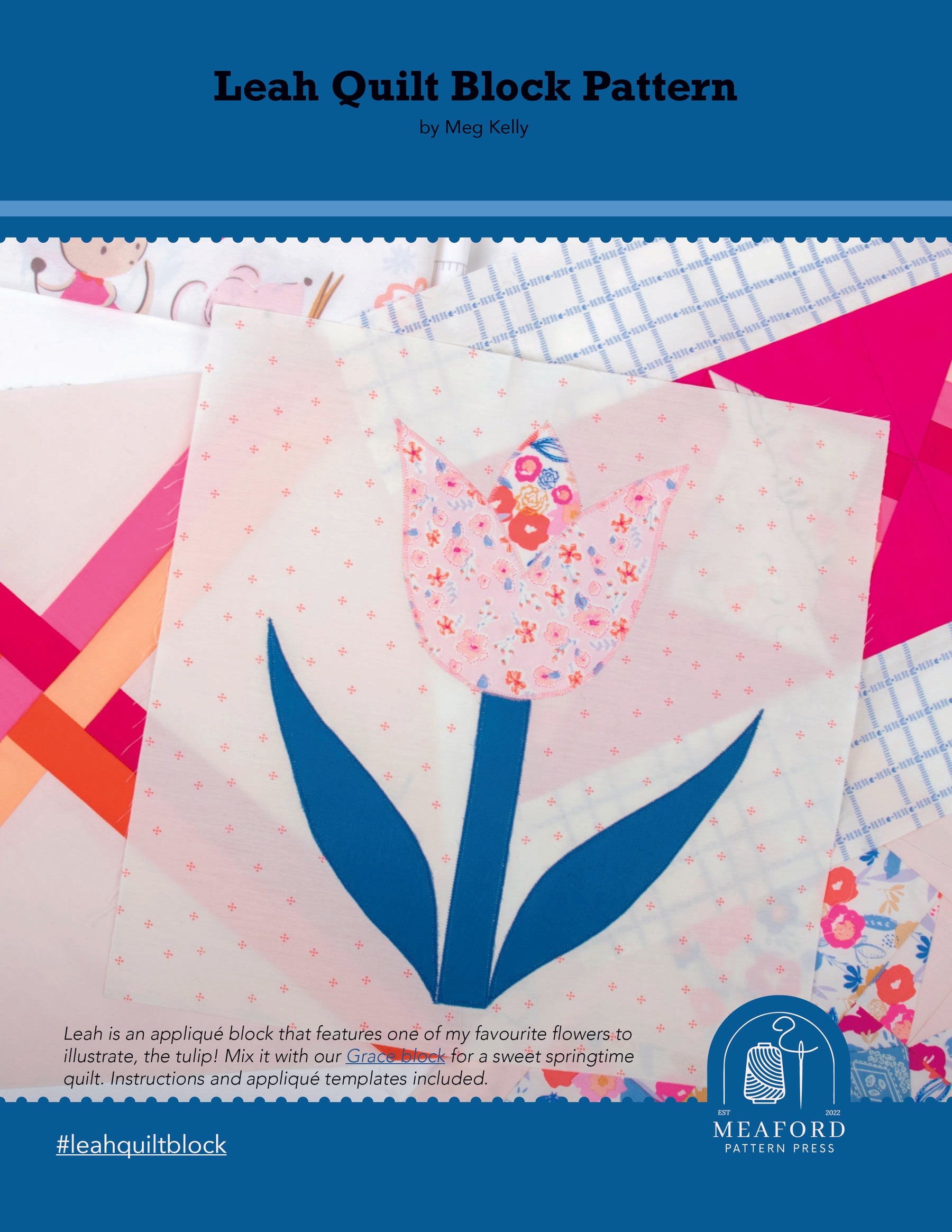 Leah is an appliqué block that features one of my favourite flowers to illustrate, the tulip! Mix it with our Grace block for a sweet springtime quilt. Instructions and appliqué templates included.