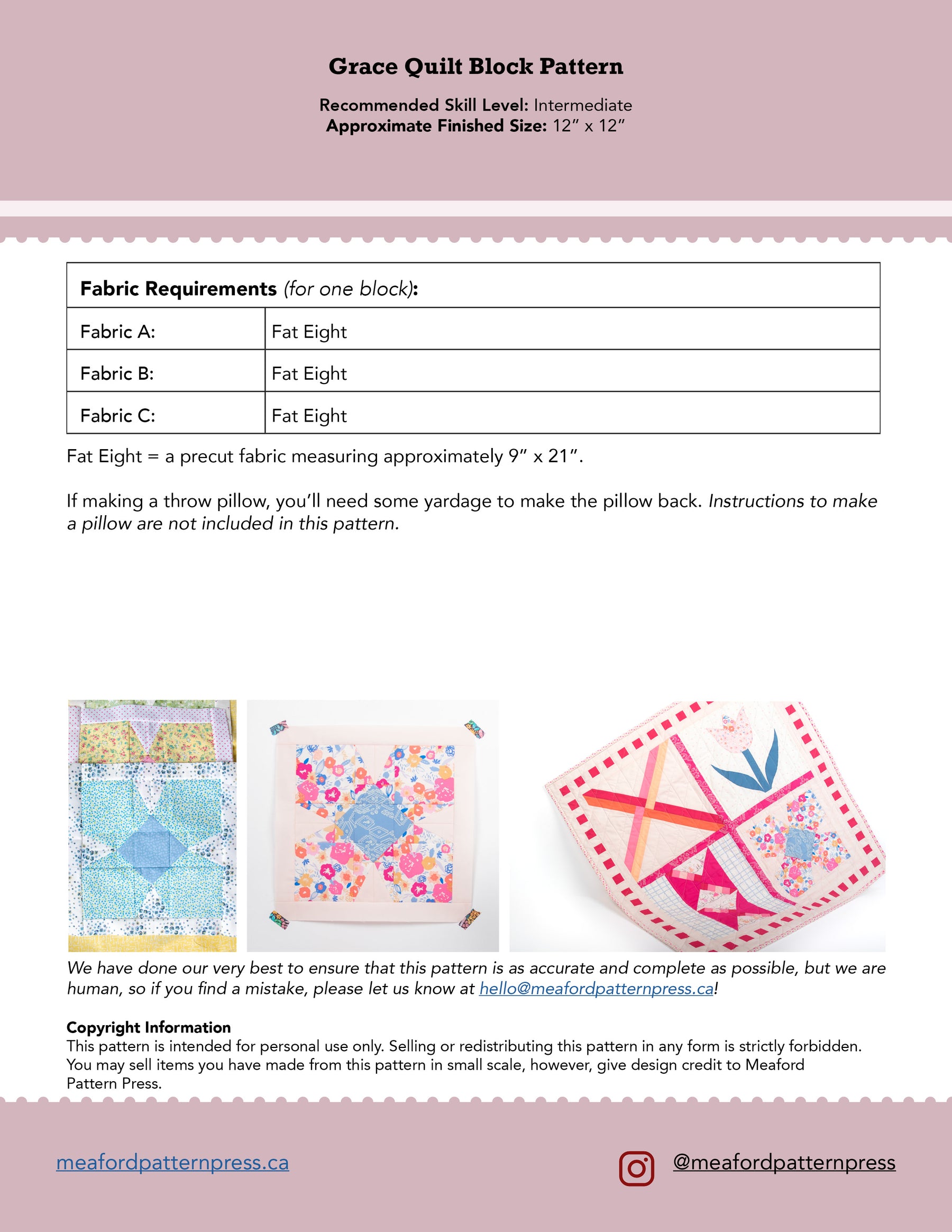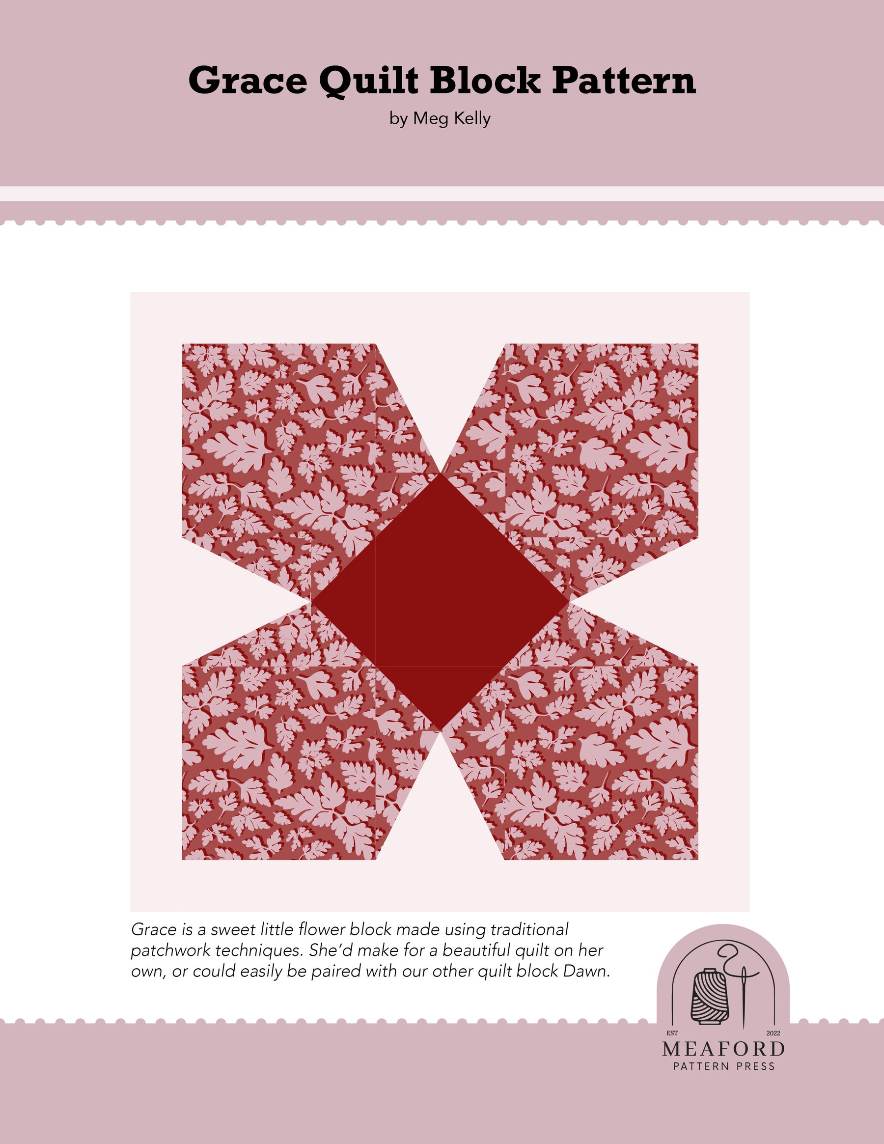 Grace is a sweet little flower quilt block pattern made using traditional patchwork techniques. She’d make a beautiful quilt (or table runner, like in the photo) on her own but could easily be paired with our other quilt block pattern, Dawn. This quilt block pattern is recommended for the intermediate quilter.