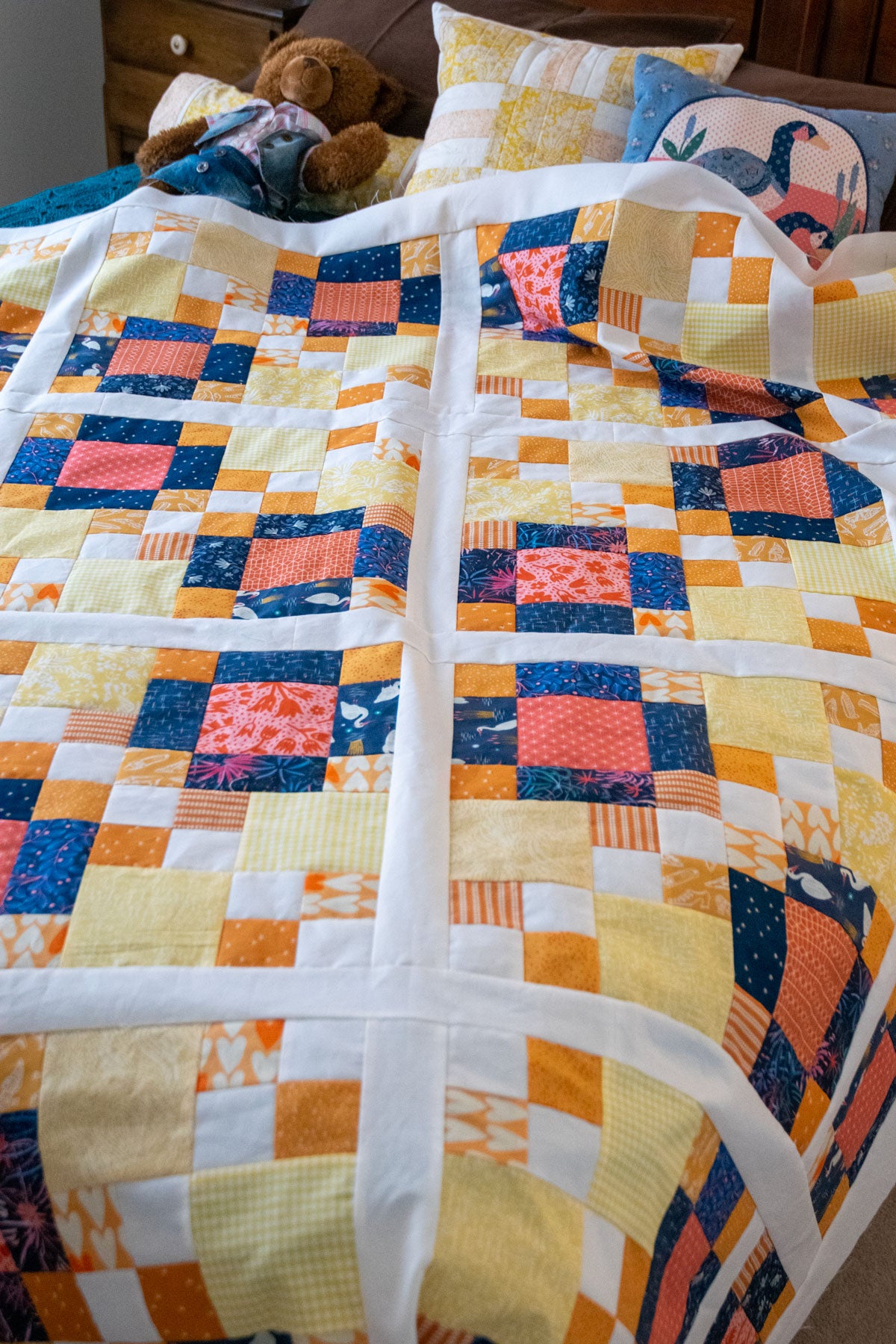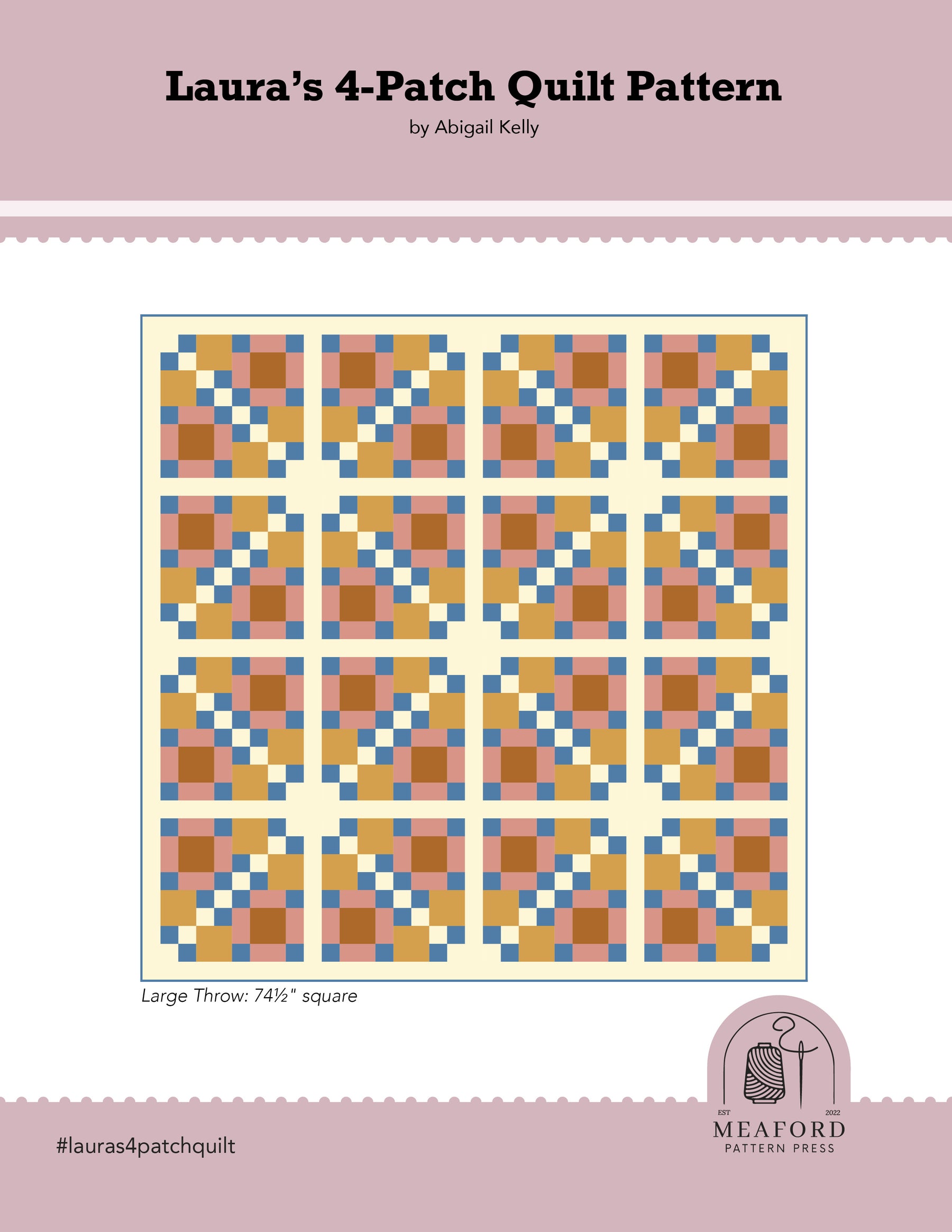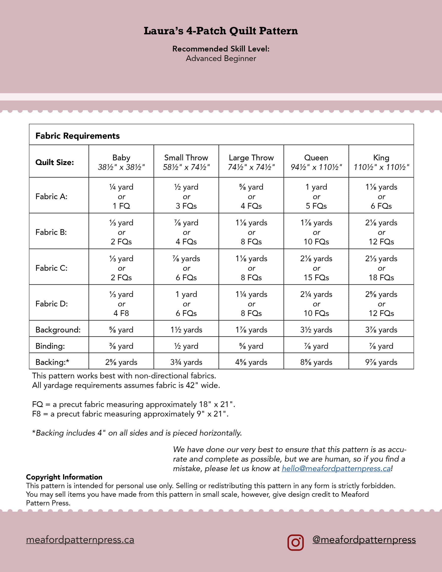 Laura's 4-Patch Quilt Pattern is a traditionally pieced quilt utilizing strip piecing and seam nesting for a bulk-free finish. Instructions include 5 sizes ranging from baby to king. The pattern also includes a Yardage Version or a Scrappy Version using FE/FQ.